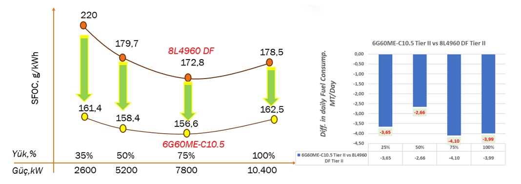 Tablo 1 ve Şekil 1 iki makinenin Tier II modunda yüke bağlı olarak özgül yakıt tüketimi ve günlük yakıt tüketim verilerini karşılaştırmaktadır. Tablo ve grafikler incelendiğinde iki makine aynı anda %35 yükte çalıştırıldığında (paralel çalışma odu) 2 stroklu makine günlük 8,2 MT tasarruf sağlamaktadır. Tüm yüklerde 2 stroklu ana makine yakıt tüketimi 4 stroklu makineden daha düşüktür.