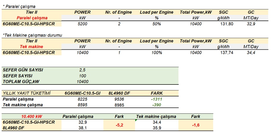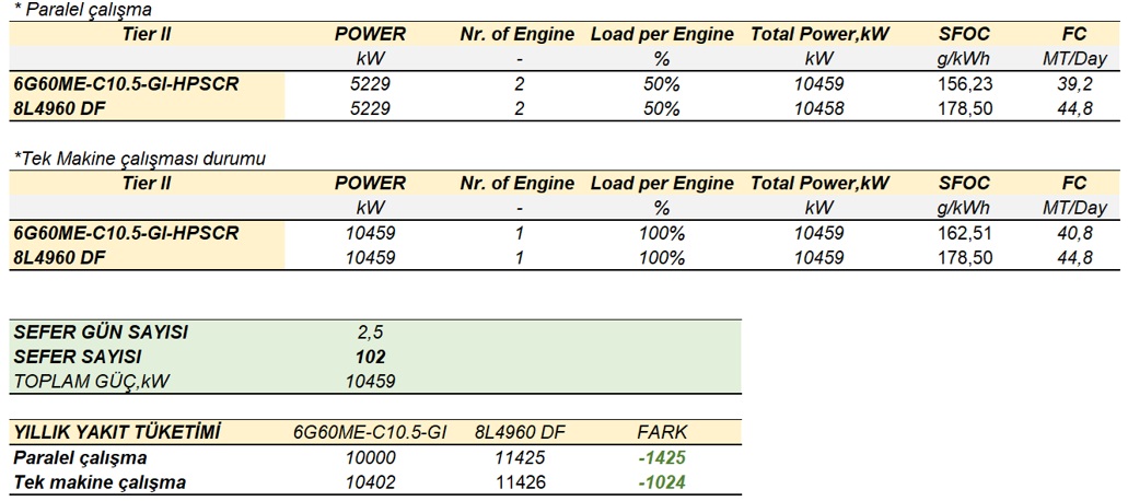 - LNG kullanımı durumunda hem 2 stroklu hemde 4 stroklu makine LNG tüketimi HFO tüketimine göre daha düşüktür. Ancak, birbirine göre karşılaştırıldığında 2 stroklu makine 4 stroklu makineye göre daha az LNG tüketilmektedir. 2 stroklu LNG ana makine kullanımı durumunda 4 stroklu LNG makineye göre yıllık 1311 MT HFO tasarrufu sağlanmaktadır (paralel çalışma modunda).