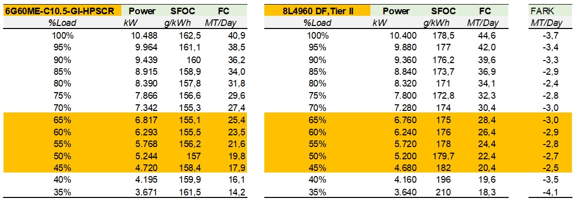 Tablo 1. 6G60ME C10.5 GI HPSCR ve 8L4960 GI DF Tier II HFO tüketim karşılaştırması