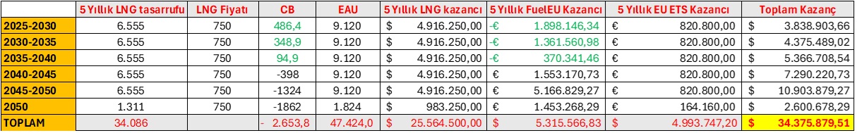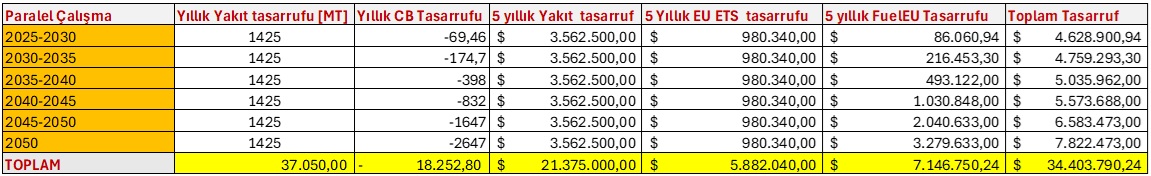 Tablo 6 da beşer yıllık periyotlardaki tasarruflar 2050 yılına kadar hesaplanmıştır. 25 yıllık sürede sağlanan toplam LNG miktarındaki tasarruf 34.086 MT, tasarrufun maddi karşılığı ise 25.564.500$ olmaktadır. LNG GHGI değeri 2025-2040 arasında pozitif olduğundan pooling ya da banking ile yapılacak kazanç kaybını ifade etmektedir. Ancak 2040-2050 döneminde fosil LNG kaynaklı yakıt cezası oluşmaktadır. Bu sürelerdeki FuelEU cezasından sağlanan kazanç 5.315.566$ olmaktadır. Paralel çalışma modunda yıllık 1311 MT LNG tasarrufun toplam değeri 25 yılda 34.375.879 $ olmaktadır. Hesaplamalara LNG fiyatı 750$ olarak hesaplanmıştır.