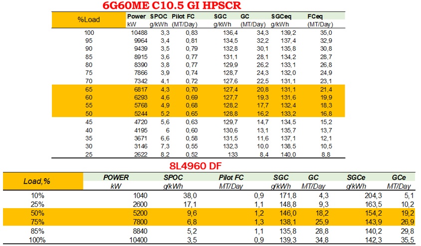 Çalışmada, 2 stroklu MAN 6G60ME C10.5 GI HPSCR ve 4 stroklu MAN 8L4960 GI DF makine karşılaştırılmıştır. Teknik veriler kendi sayfasından alınmıştır.