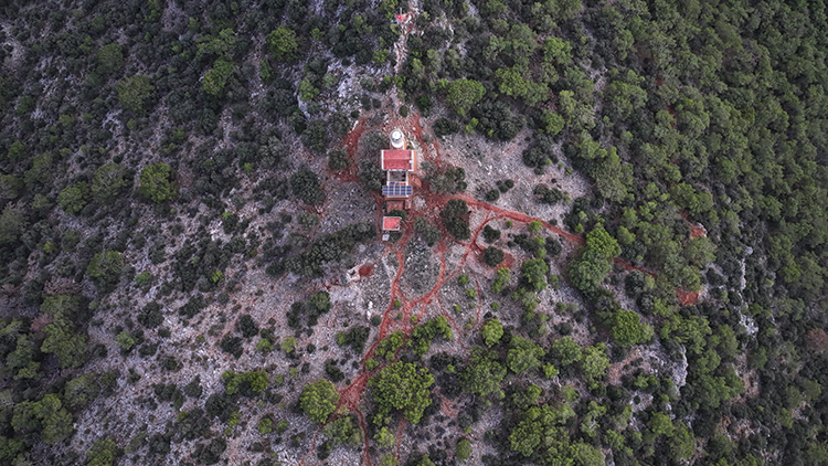 Likya Yolu'nda karaçamların arasında patika yoldan 2 kilometrelik yürüyüşün ardından tarihi fenere ulaşılıyor.