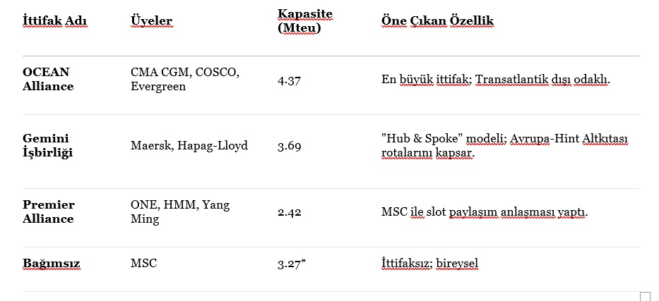 Dünya ticaretinin bel kemiği olan deniz konteyner taşımacılığı, inanılmaz ölçek, karmaşıklık ve rekabetle şekillenir. Tek başına hareket etmenin maliyetleri ve riskleri artık çok yüksek olduğundan, önde gelen konteyner hatları (shipping lines), rekabet içinde işbirliğinin en üst düzey modeli olan "alliance" (ittifak) sistemini geliştirmişlerdir.