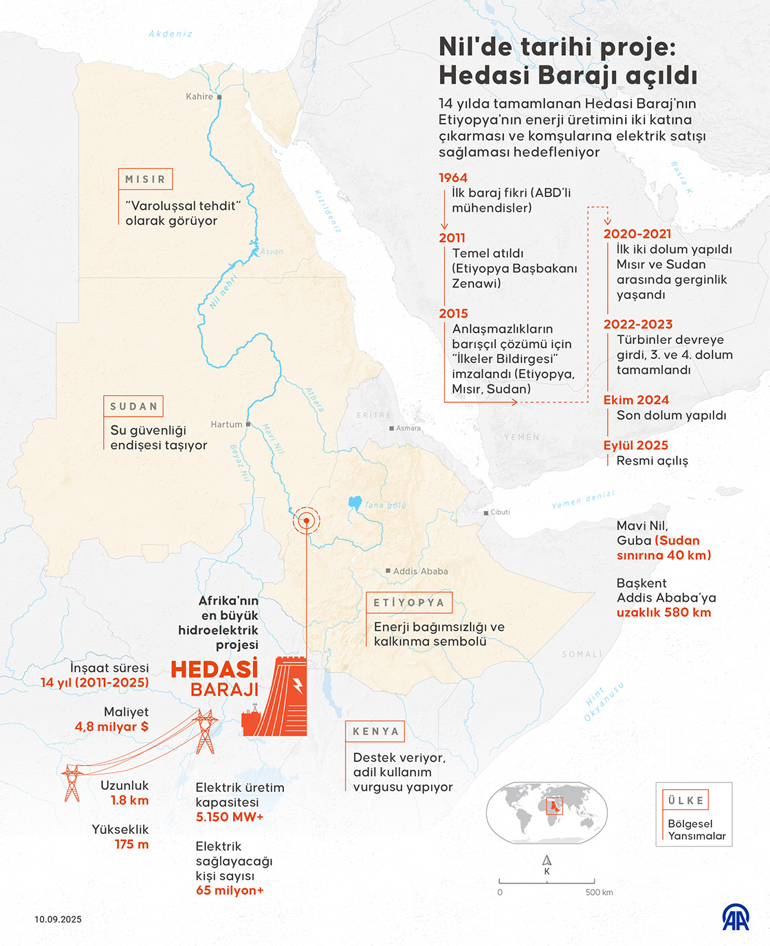 AA muhabiri, Hedasi Barajı'nın tarihsel arka planı, teknik özellikleri ve Nil sularının paylaşımı konusunda Etiyopya, Mısır ve Sudan arasında yaşanan gerilim ile barajın açılmasına ilişkin iki ülkenin tepkilerini derledi.
