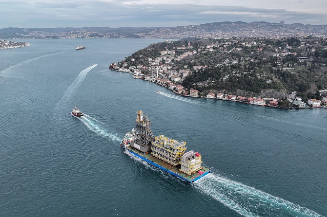 Osman Gazi Yüzer Üretim Platformu'nun parçaları ile Yıldırım Sondaj Gemisi'nin kulesini taşıyan geminin boğazdan geçişi 2 saat sürdü.