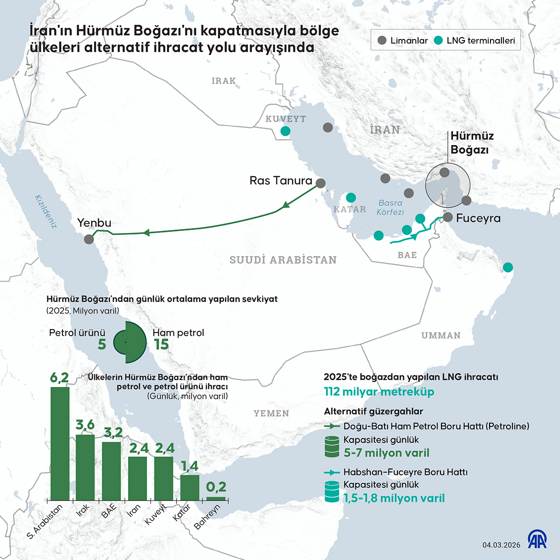 İran'ın Hürmüz Boğazı'nı gemi geçişlerine kapatmasının ardından Orta Doğu'daki petrol üreticisi ülkeler, petrol ihracatını sürdürebilmek için alternatif güzergah arayışına yöneldi.