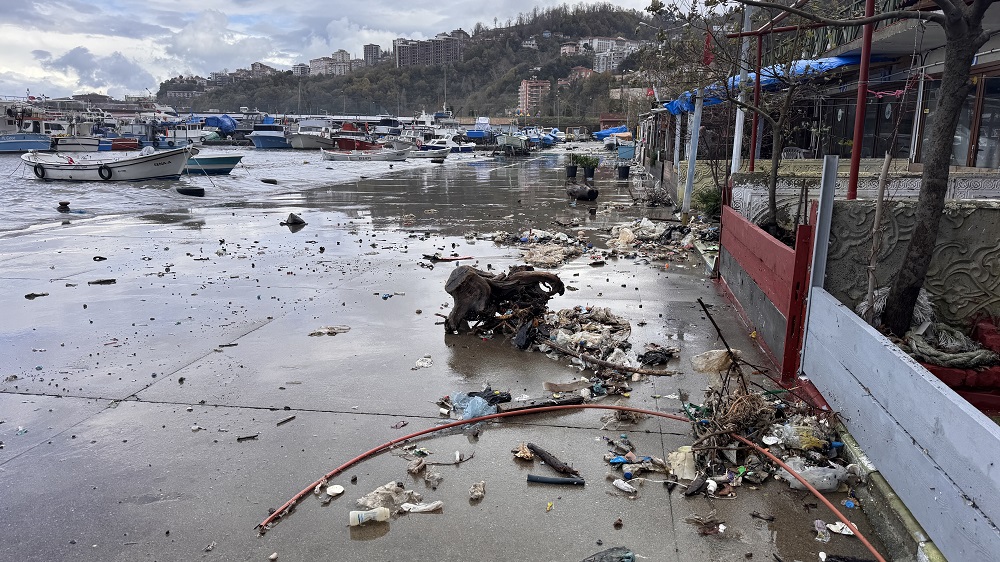 Suların taşıdığı çöpler limanı kaplarken, balıkçılar zarar görmemesi için kayıkları ve ağları liman dışına taşıdı.