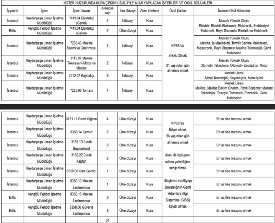Kura yöntemiyle alım yapılacak işçiler için adaylar, ilan edilen meslek yüksekokulu programlarından mezun olmalı ve ilan tarihi itibarıyla 31 yaşını doldurmamış olmalıdır. Gemiadamı pozisyonları için yaş sınırı 36’dır.