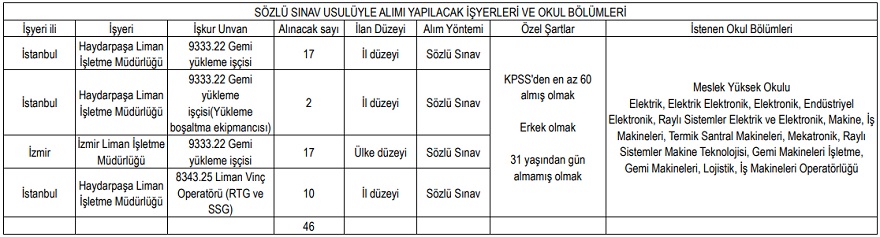 Sözlü sınavla alım yapılacak işçiler, ilgili meslek yüksekokulu programlarından mezun olmalı ve ilan tarihi itibarıyla 31 yaşından gün almamış olmalıdır. Haydarpaşa Liman İşletme Müdürlüğüne başvuracak adayların İstanbul il sınırları içinde ikamet etmesi gerekmektedir.