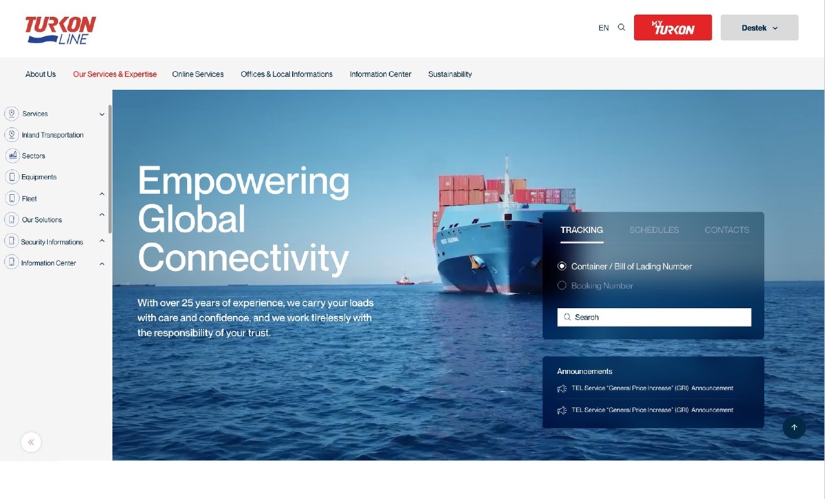 Deniz taşımacılığı sektöründe uluslararası standartlarda hizmet sunan Turkon Line, dijital varlığını güncel ihtiyaç ve beklentilere göre yeniden tasarlayarak yenilenen web sitesini hizmete açtı. Yeni web sitesi; gemi programı, konteyner takibi, servis detayları, lokal mevzuatlar ve diğer tüm hizmetlerin tek bir platformda toplanmasıyla, kullanıcılarına her cihazdan kolay, hızlı ve kesintisiz erişim sağlıyor.